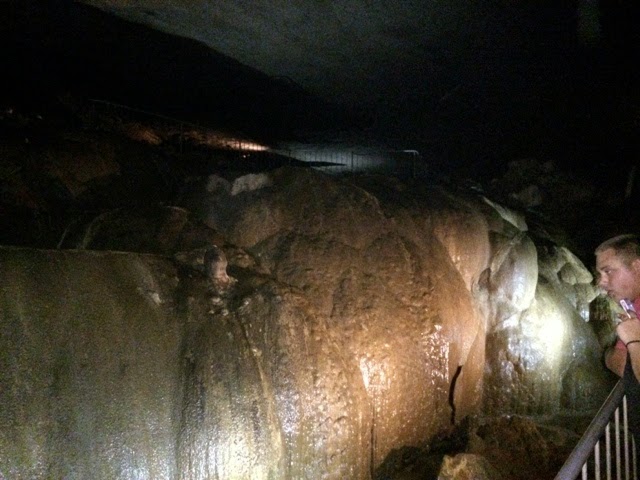 We then stopped at the flow stone wall. I peered up as I attempted to soak in the enormity of the massive 32 foot wall. The surface glistened and appeared to dance in the incandescent light cast from down below. My eyes followed across the smooth hilly top of the structure and down the grooves that separated the mounds. I decided that they looked like giant molars and snapped a couple of pictures of it. This is when Elmo put his hand on my shoulder and told me that he was going to toss me over the side. Before the tour kicked off I had made a joke, as I often do, and his idea of retribution was to make me a permanent fixture on the enormous flow stone wall. He pointed at what appeared to be a face on the side of the wall and calmly stated "that was the last guy who made jokes during one of my tours". Of course he was only kidding and I got that, but after he made his way back to the front of the tour, one of the group members said "I didn't know what he was about to do when he snuck up behind you like that". I just laughed and and snapped a few more pictures. Elmo hopped back on the golf cart, and the tour continued.